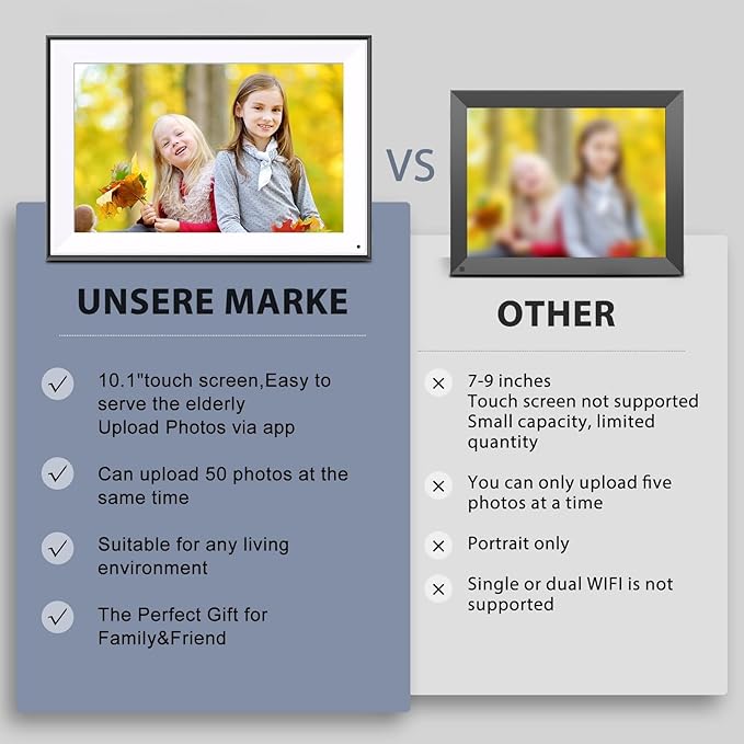 - [Thoughtful Gift, Sincere Help]: This 10.1” Wi-Fi digital photo frame 16GB is the perfect gift for moms, dads, and grandparents who cherish glimpses into the lives of their loved ones. Easily set up slideshows to display your favorite pictures on the digital frame. And if you need any assistance, our dedicated customer service team is here to provide sincere help, advice, and troubleshooting, ensuring a seamless experience for you and your loved ones.