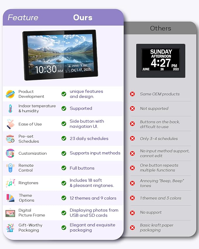 - ๐๐ฎ๐ข๐ฅ๐ญ-๐๐ง ๐๐ข๐ ๐ข๐ญ๐๐ฅ ๐๐ข๐๐ญ๐ฎ๐ซ๐ ๐ ๐ซ๐๐ฆ๐: More than just a clockโinsert a USB flash drive or SD card (๐๐ฝ ๐๐ผ ๐ฒ๐ฐ๐๐, ๐ป๐ผ๐ ๐ถ๐ป๐ฐ๐น๐๐ฑ๐ฒ๐ฑ) to display your favorite photos and relive precious memories on the screen.(SD card and USB type: SD, SDHC, SDXC, USB2.0, support for maximum capacity of 64G)
