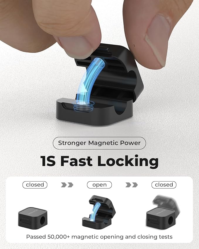 - Magnetic Locking & No Falling Off: Secure magnetic grasp opening and closing allow easy cord in,and powerful magnetic lock the organizer firmly to hold any charging head without falling off, more convenient to pull the cables out for smoothly using